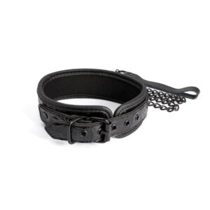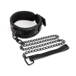 Take your sexy sub on a walk. This collar and leash set looks and feels luxurious and sexy. Secure the collar around your partner’s throat, and adjust easily with buckled closure. The strap easily fits a wide range of sizes, and the leash attaches with a long chain and D-ring. Communication with your play partner is essential! Always use restraints with consent.