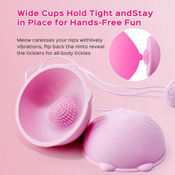 Designed with a cute kitty appearance, Meow, the nipple suckers, are velvety silicone scoops that create a tight seal, delivering stimulating suction while the soft ticklers inside tease your nip and areola combined with arousing vibrations. Meow gives you otherworldly pleasure that enhances your nipple sensitivity and perks them up for unforgettable play.
