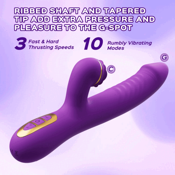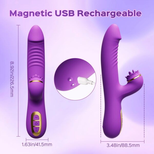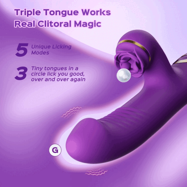 With a ribbed shaft and the 3-tongue clit teaser, this triple-action rabbit toy is your ticket to irresistible blended organs! Its powerful shaft reaches deep inside to please your G-Spot with lifelike thrusts and vibrations, while a unique, rose-shaped stimulator treats your clit with 3 licking tongues for soooo many ways to play!